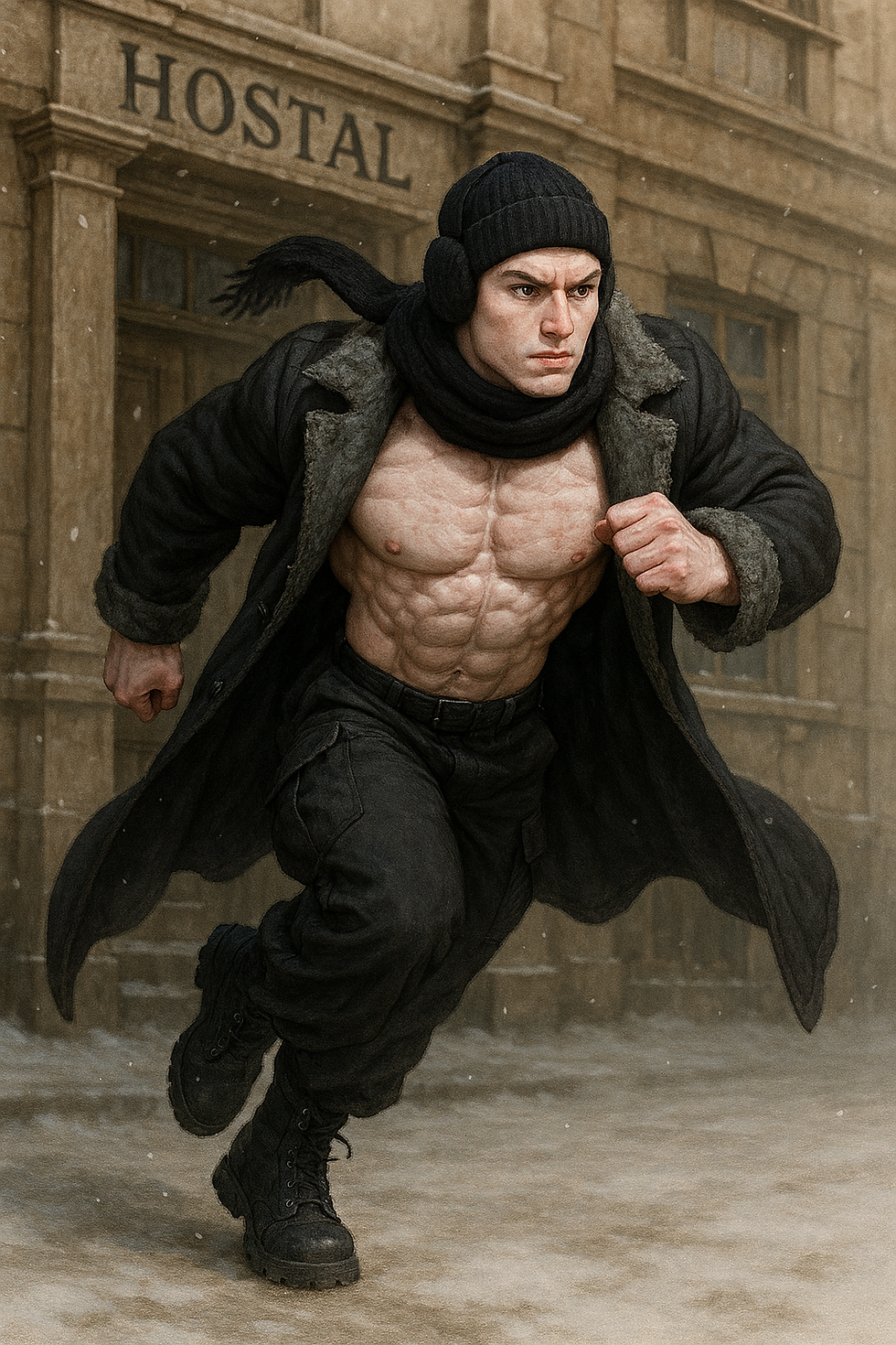 Altruista: crea un hombre de 24 anos, piel blanca muy clara, cabello rubio palido corto ondulado peinado con el flequillo alborotado, diminutos ojos celestes rasgados, cabeza cuadrada, orejas pequenas, nariz pequena y afilada apuntando hacia arriba, boca pequena de labios gruesos, mandibula cuadrada, barbilla afilada con hoyuelo, 1.82 m de altura y 110 kg de musculatura poderosa, definida y venas marcadas. Viste uniforme militar con patrones blancos con negro, abrigo negro que le cubre hasta los pies cuya capucha cae a sus espaldas afelpada y botas gruesas. Se encuentra marchando decidido sujetando un subfusil con ambas manos enfrente de una iglesia ortodoxa colorida.