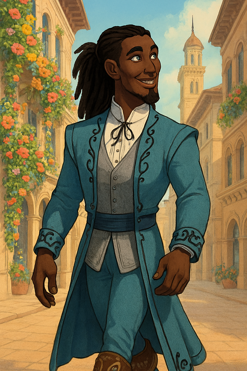Zyrloin: crea un hombre de 24 anos, piel blanca clara, cabello rubio oscuro corto ondulado peinado con el flequillo hacia arriba, ojos azul oscuro, cabeza cuadrada, orejas pequenas, nariz pequena y un poco gruesa, labios gruesos, mandibula cuadrada, barbilla con hoyuelo,, 1.84 m de altura y 120 kg de musculatura poderosa, definida y venas marcadas. Viste uniforme militar con estampado gris oscuro con azul, laminas puestas tanto en pecho, entrepierna, hombros y muslos y botas pesadas. Se encuentra con una pequena sonrisa que se marca mas de un lado de la cara sosteniendo un casco militar de estructura metalica debajo del brazo mientras flexiona los biceps del brazo libre. Esta bajando las escaleras de un cuartel militar decorado con banderas azules separadas en 4 por una cruz plateada, teniendo una flor de lis en cada uno de los espacios.