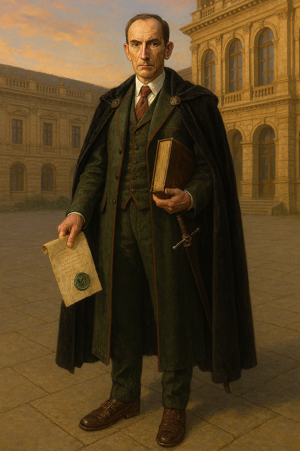 Kasper Ramielson: Crea la un hombre de alrededor de 36 anos, complexion delgada, piel blanca, ojos cafes claros, cabello castano peinado de lado, cejas delgadas, grandes lentes, cejas medianas, nariz mediana,labios medianos, barbilla mediana y circular, 1.86 m de altura y 80 kg de peso. Viste traje con chaleco incluido color plateado, camisa azul oscura y corbata de franjas azules con plateado. Tiene una marcada sonrisa, brazos tras la espalda y pecho en alto. Se encuentra detras de un estrado que tiene al centro el escudo de un aguila harpia de alas extendidas que sostiene con una pata una espada y con la otra un cetro dentro de un cuartel militar a oscuras decorado por una pareja de estatuas de aguila harpia extendiendo las alas y en las paredes banderas azules divididas por una cruz plateada en 4, estando en cada uno de esos espacios una flor de lis.