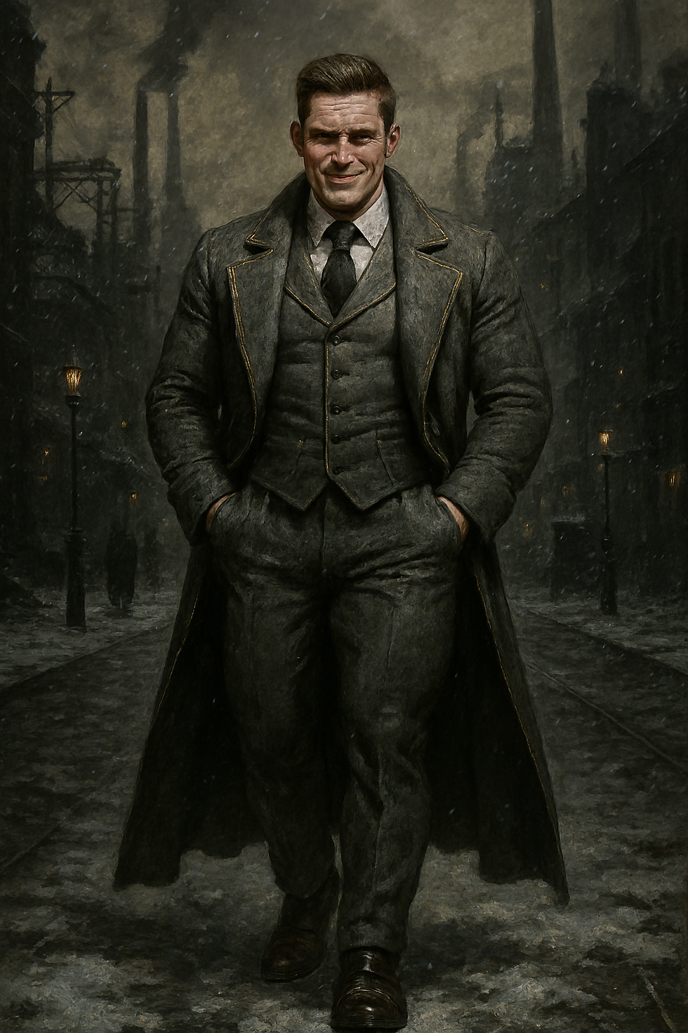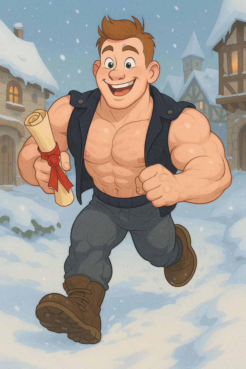 Hans: Crea un fisicoculturista de alrededor de 24 anos, de piel blanca muy clara, cabello corto castano claro con el fequillo peinado hacia arriba y algo despeinado, pequenos ojos verdes, cejas pequenas y medianas, orejas pequenas, cabeza ovalada, nariz pequena y un poco gruesa, mandibula cuadrada, barbilla un poco grande y redonda, boca pequena de labios gruesos, un poco cacheton, 1.66 de altura, 90 kg de musculo definidio y vascular, destacando principalmente en el volumen de sus brazos. Viste pantalones grises con chaleco blanco con ligera tendencia al gris, camisa negra de mangas largas y abrigo oscuro aterciopelado con broches en los hombros. Hazlo en estilo grimdark caminando sonriente en un poblado nevado sosteniendo un pergamino protegido por un liston rojo y un sello imperial.