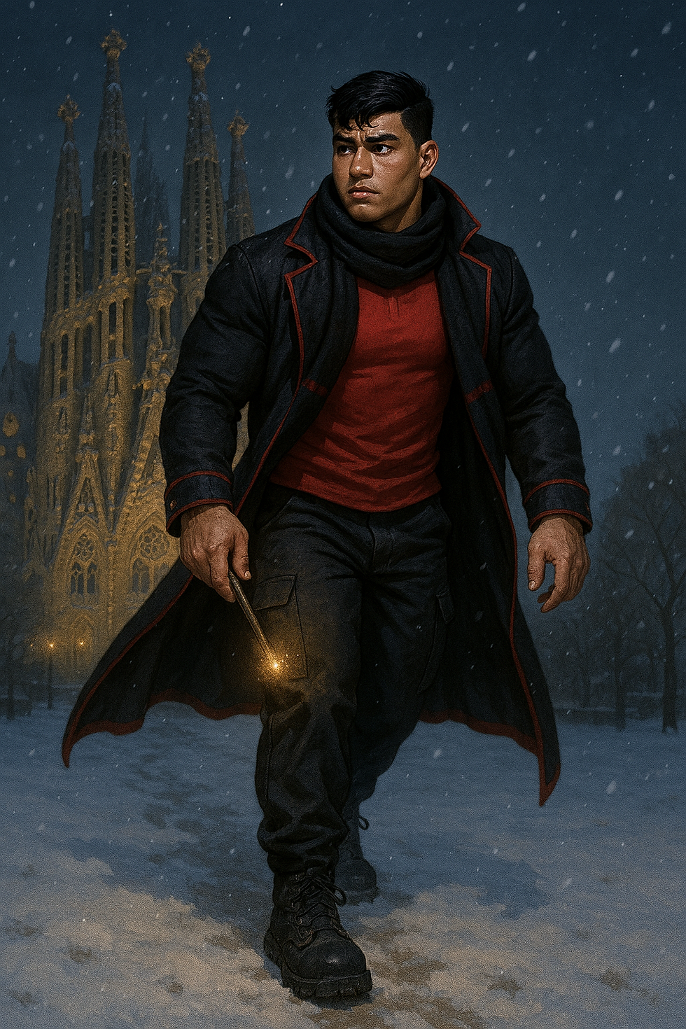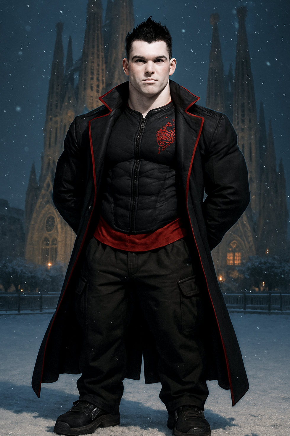 Toddy: crea a un joven de 18 anos, piel morena clara, cabello negro corto peinado en espinas hacia el centro, ojos oscuros, cejas medianas, cabeza casi redonda, nariz un poco grande, cacheton, barbilla redonda, labios medianos, 1.70 m de altura y 80 kilos de peso en musculo y complexion atletica. viste pantalones negros estilo cargo, camisa gris gastada, gabardina negra larga de contornos rojos brillantes y calzado deportivo estilo skater. Hazlo en estilo fantasia oscura serio y cruzado de brazos enfrente de una iglesia parecida a la sagrada familia con un huron de pelaje rojo posado en su hombro.