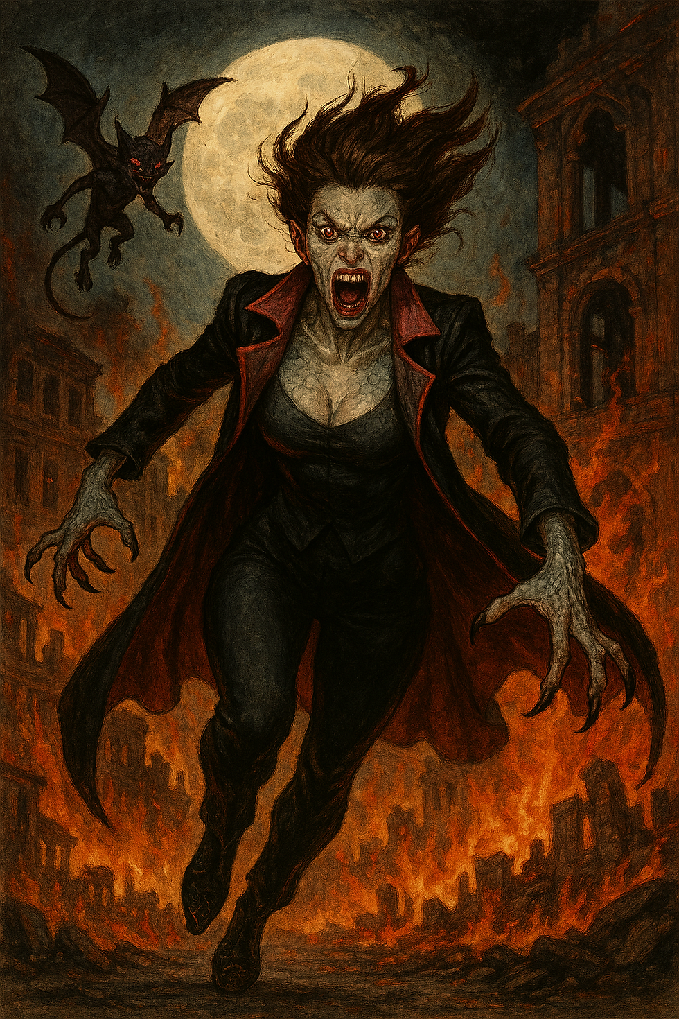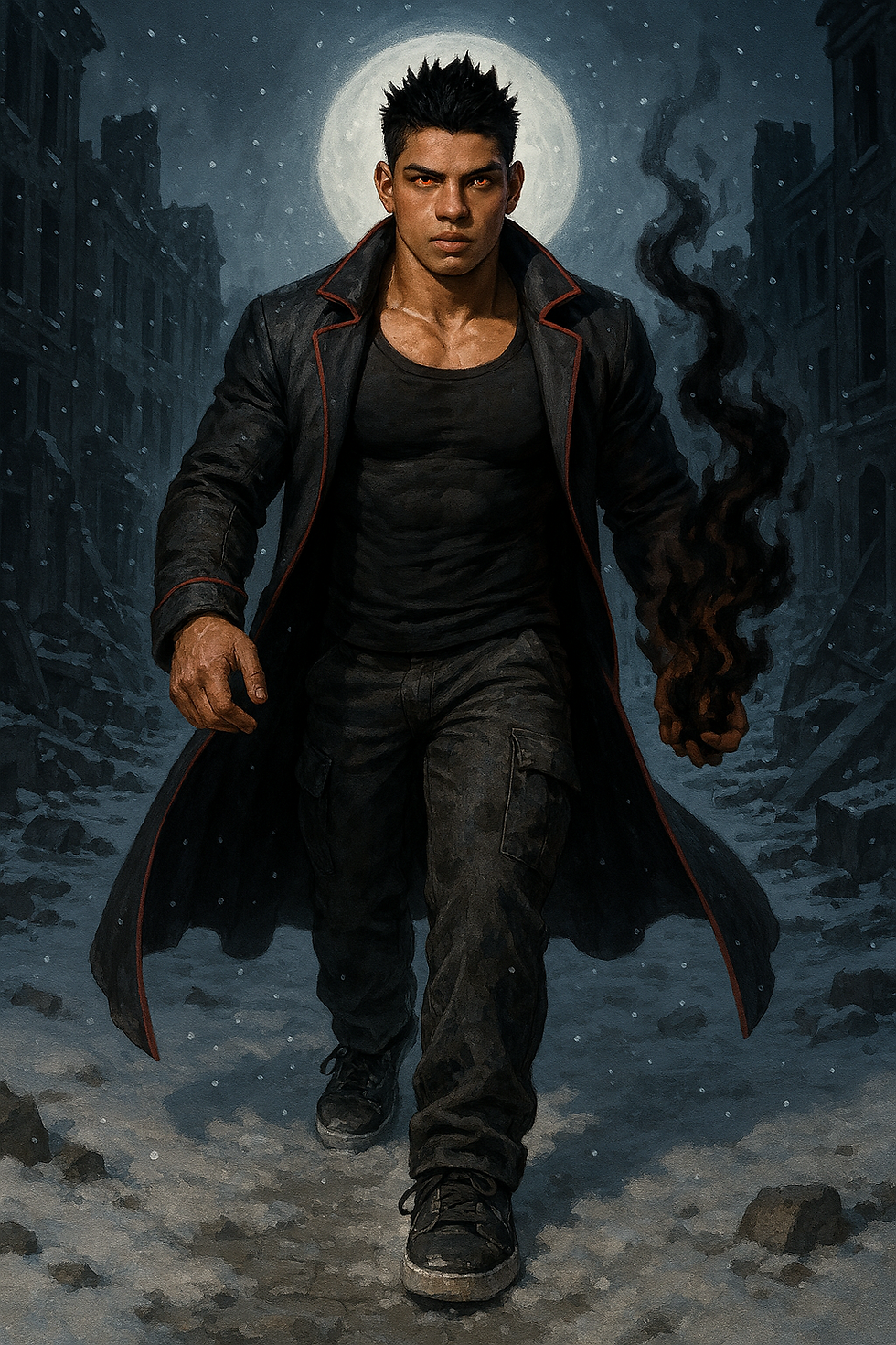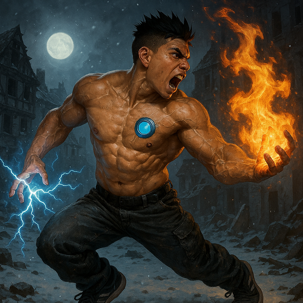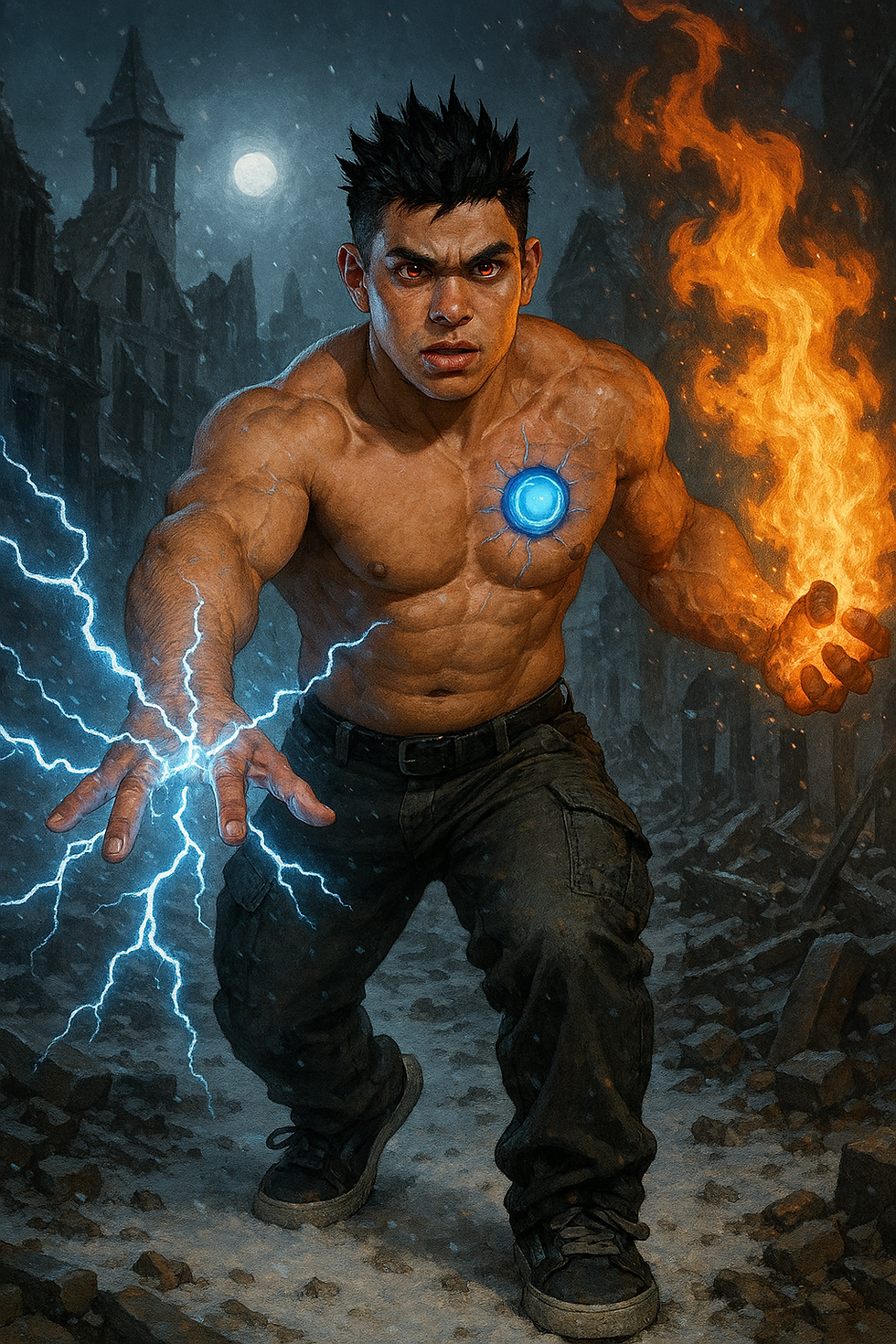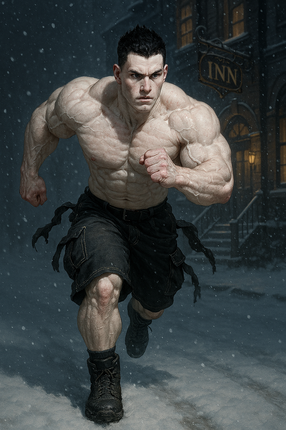 crea a un fisicoculturista de alrededor de 21 anos, piel blanca palida, cabello negro corto peinado en forma de puntas centradas hacia arriba, pequenos ojos azul oscuro, cejas medianas, orejas pequenas, cabeza ligeramente alargada, nariz mediana ligeramente redondeada, mandibula cuadrada, barbilla ligeramente afilada con hoyuelo, labios medianos, 1.74 m de altura y 125 kilos de musculo definido y venas marcadas, cuello grueso, piernas poco mas cortas de lo normal y pantorrillas desarrolladas. Usa shorts estilo cargo negros largos y holgados cuya longitud llega a cubrir la mitad de sus pantorrillas, una cadena gruesa en el bolsillo derecho, camisa blanca de cuadros negros arremangada hasta los codos, tunica negra aterciopelada negra y calzado deportivo estilo converse negros de suelas blancas. Se encuentra corriendo decidido en el campo de batalla a las afueras de un castillo donde el cielo es negro y las nubes arrojan relampagos rojos.