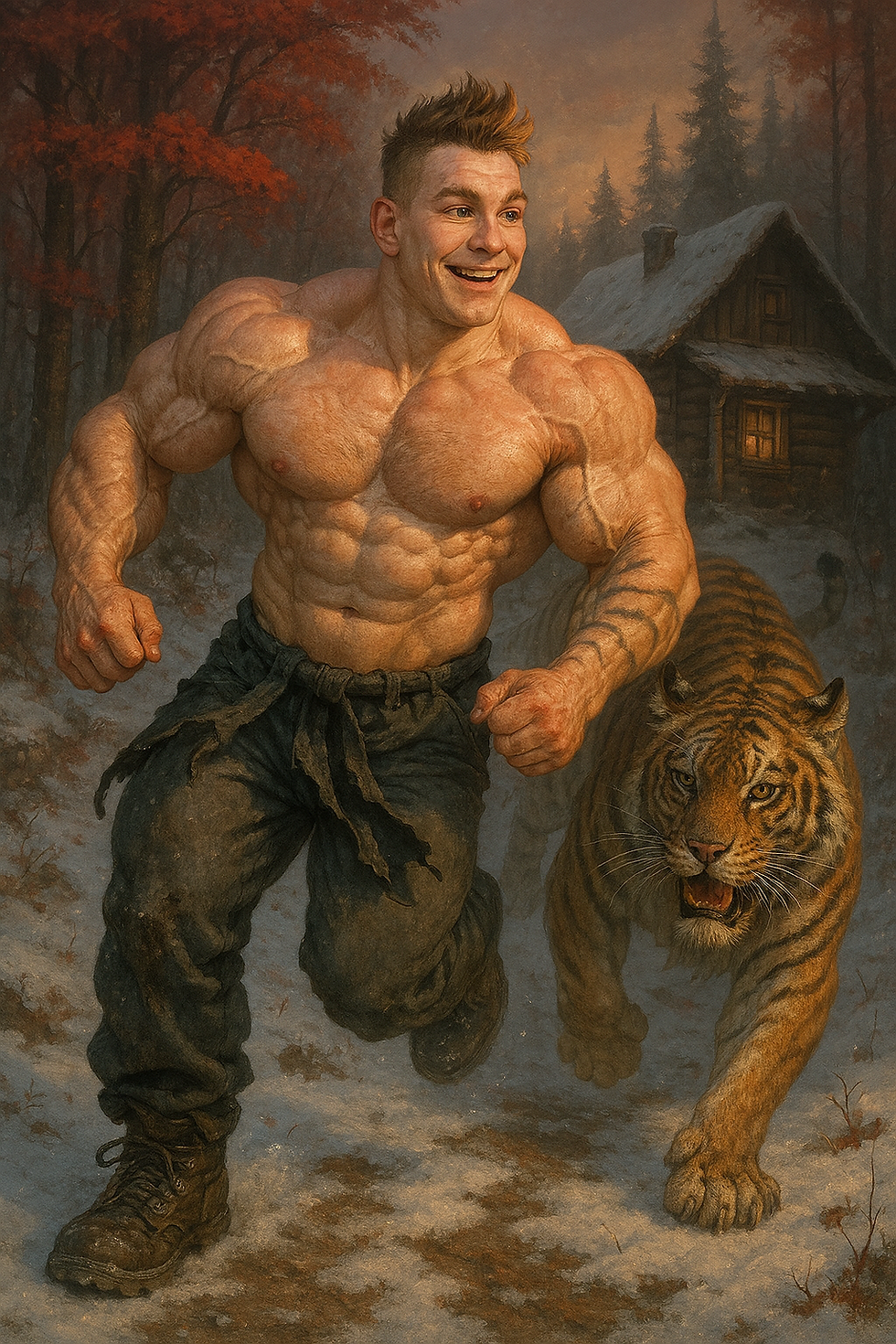 crea un fisicoculturista de 24 anos, de piel blanca muy clara, cabello corto castano claro con el fequillo peinado hacia arriba y algo despeinado, pequenos ojos verdes, cejas pequenas y medianas, orejas pequenas, cabeza ovalada, nariz pequena y un poco gruesa, mandibula cuadrada, barbilla un poco grande y redonda, boca pequena de labios gruesos, un poco cacheton, 1.66 de altura, 90 kg de musculo definidio y vascular, destacando principalmente en el volumen de sus brazos. Viste pantalones grises holgados poco mas abajo de la cintura con pedazos de lo que solia ser su camisa negra sujeta de la cintura de estos y calzado deportivo estilo bota holgada. Hazlo en estilo fantasia oscura arrodillado sobre la nieve con mirada baja, puno en el suelo y cobija con parches sobre la espalda a las afueras de una cabana en un entorno boscoso nevado de arboles rojos durante el amanecer.