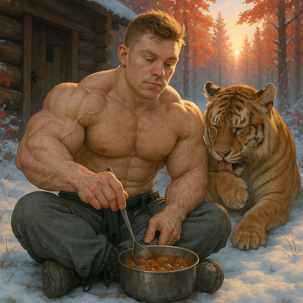 crea a un fisicoculturista de alrededor de 21 anos, piel blanca palida, cabello dorado corto rapado de los alrededores y un poco alborotado, ojos plateados, cejas medianas, cabeza ligeramente alargada, nariz mediana perfectamente simetrica, mandibula cuadrada, barbilla ligeramente afilada con hoyuelo, labios medianos y fuertes, 1.76 m de altura y 110 kilos de musculo definido y macizo. Viste shorts deportivos largos y holgados negros con franjas blancas que le cubren debajo de las rodillas y calzado deportivo estilo converse negros de suelas blancas. Se encuentra de pie con los brazos cruzados en un entorno nevado con debil sonrisa mientras un oso kodiak con una capa negra sobre la espalda esta parado sobre sus patas traseras a su lado.