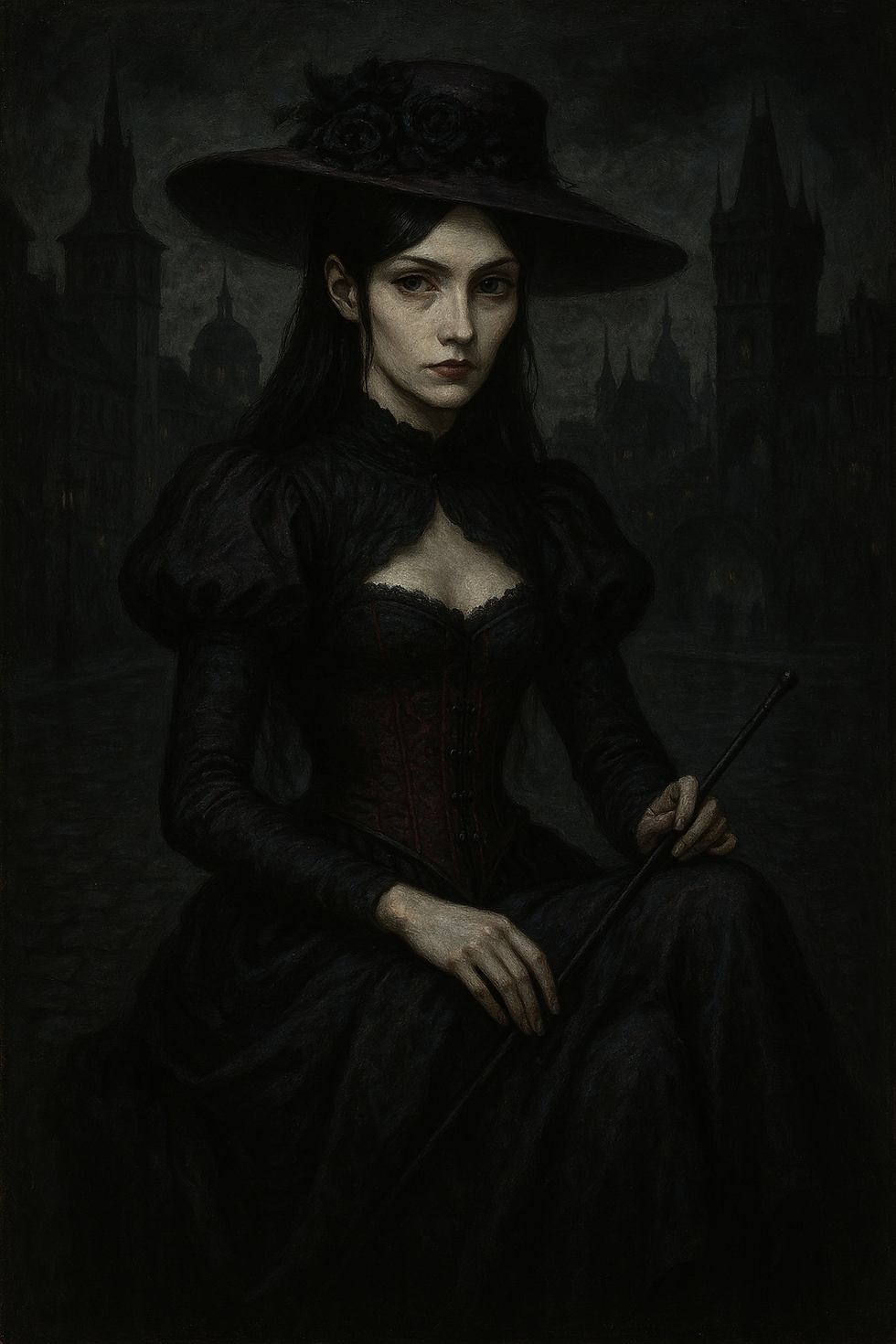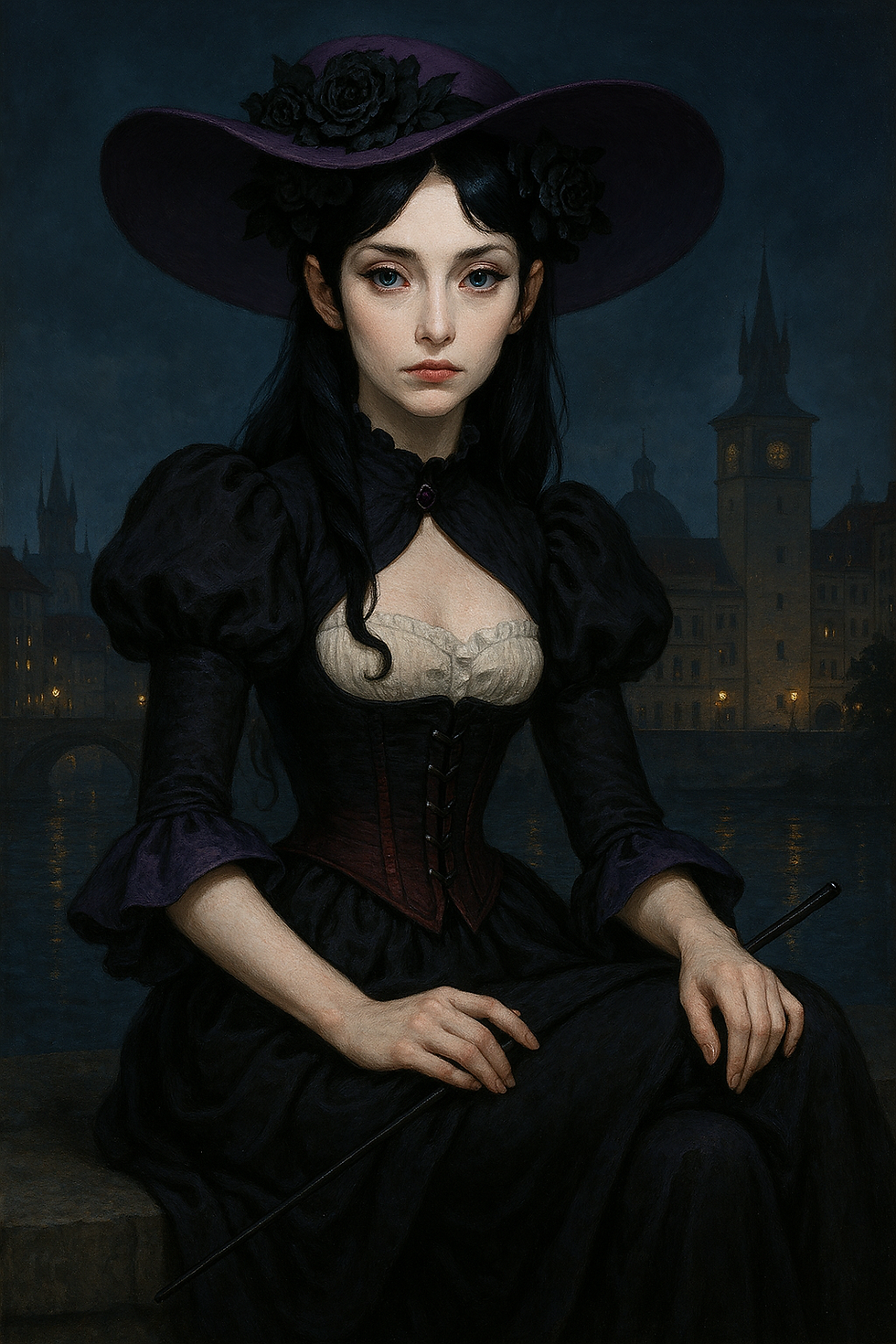 Gabrielle Grammerson: crea a una joven de 19 anos, piel blanca muy clara, cabello azul oscuro que le cae por debajo de los hombros ligeramente ondulado, ojos azul claro, cejas delgadas, cabeza en forma de corazon, nariz pequena y perfectamente triangular, pomulos marcados, barbilla ligeramente afilada, boca pequena de labios medianos, 1.70 m de altura y 60 kilos de peso con proporciones equilibradas. Usa vestido verde de mediados del siglo XIX, tunica cafe con runas en las mangas y sostiene una varita. Se encuentra en los pasillos del metro coyoacan con expresion interesada y en compania de un husky albino.